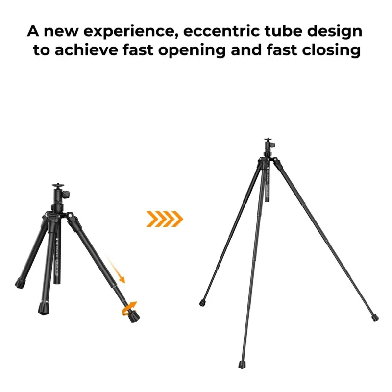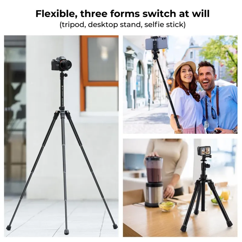 The flexible tripod by K&F Concept offers versatile functionality, seamlessly transitioning between a tripod, desktop stand, and selfie stick to cater to various photography needs, whether youre traveling, vlogging, live streaming, and more. Its unique eccentric tube design ensures fast and effortless setup, allowing you to focus on your photography without wasting time. This tripod is highly portable for travel, with its 4-section adjustable tube, ranging from 36cm/14.1 to 170cm/66.9, and a compact folded length of only 30cm/11.8, weighing a mere 0.88KG/1.94 lbs. It boasts great compatibility, featuring a standard 1/4 inch thread suitable for most Arca-Swiss quick release plates, and a 1/4 screw for various devices, including cameras, DSLRs, projectors, telescopes, and even cellphones for selfies, live broadcasts, and time-lapse shooting. With a sturdy bearing capacity of 4KG/8.8 lbs and a smooth, oil-damping-free design, it facilitates precise camera rotation, while the 360-degree horizontal scale at the base enhances panoramic photography, yielding impressive results that rival ultra-wide-angle lenses.