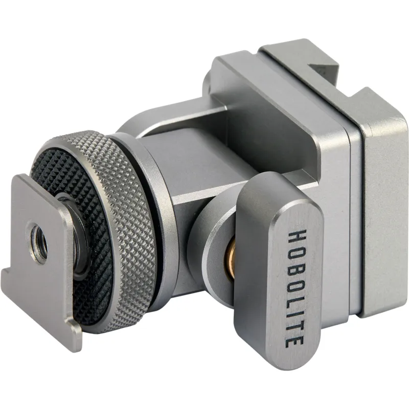 The V-Mount Cold Shoe Adapter features a V-Mount for quick attachment and release of the Micro and Mini devices. The cold shoe slot enables mounting to a camera, while the locking handle allows for a 180-degree rotation to position the light at the perfect angle.