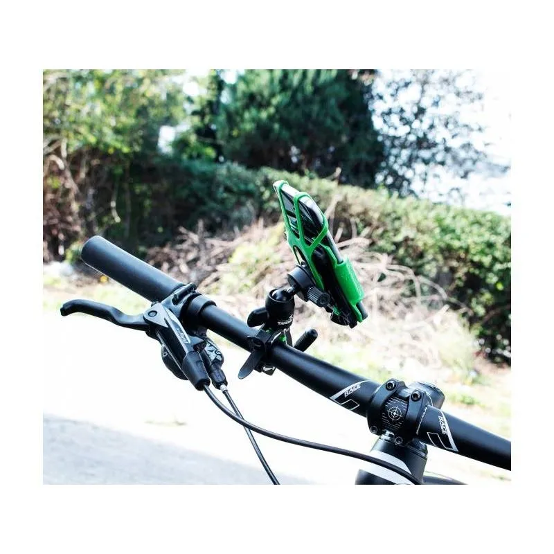 The Takeway T-PH03 is a phone holder compatible with the Takeway mounting system. The mount is designed to provide maximum security and usability for the device mounted in it. The holder's side arms hold the phone securely while protecting it from damage. The included rubber band prevents the phone from slipping out of the mount when cycling or motorcycling, even on the roughest terrain. Its lower support features a hole that allows a micro USB / lightning cable to be plugged into the device port. The Takeway T-PH03 mounts phones from 4 to 6 inches and weighs no more than 300g. The mount comes with an integrated plate that allows it to be mounted on T-B01 and T-B02 heads, as well as R1 and R2 universal mounts. The Takeway T-PH03 is made from aircraft-grade aluminium alloy and premium plastic, making it lightweight and durable. Specification model: T-PH03 dimensions: 11 x 6.8 x 4.5 cm weight: 85 g lifting capacity: up to 300 g material: aluminium alloy, plastic colour: black, green Compatibility universal mounts R1 Ranger, R2 Ranger, T1 Clampod, T1+ Clampod ball heads T-B01, T-B01 flexible arm T-FN01 Kit contents phone holder T-PH03 phone holder T-AP02