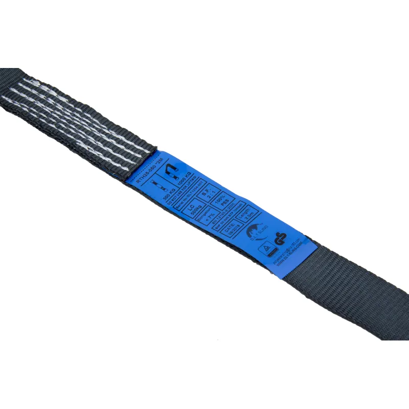Черный ремень с храповым механизмом оснащен плоскими крючками, ширина составлет 25 мм, а длина - 5 м. Он в первую очередь предназначен дл надежной фиксации вашего автомобильного креплени с помощью ремн, зацепленного за автомобиль.