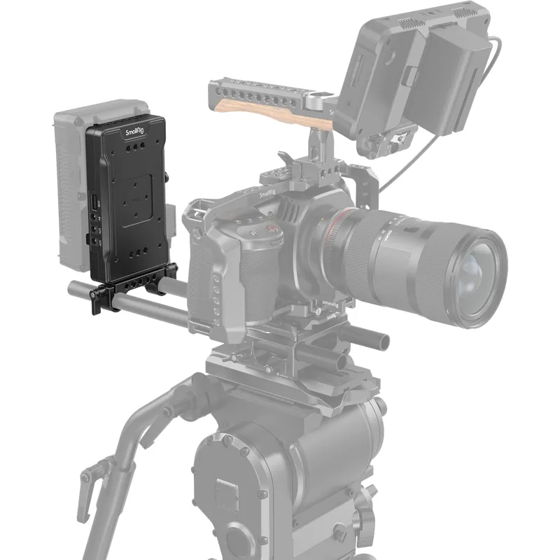 SmallRig V Mount Battery Adapter Plate with Dual 15mm Rod Clamp 3203 is designed to provide greater battery life to your camera rig via a V mount battery. The plate utilizing a standard V mount fits most V mount batteries. It gives an 8V DC output port, two 12V DC output ports, a 14.8V D-Tap output port, and a 5V/2A USB output port to power your camera and other external accessories like a monitor, a phone, etc. via a V mount battery. It features a power switch that controls all of the output ports to power-on or power-off your rig more quickly and conveniently. It comes with a dual 15mm rod clamp to help mount the plate to your 15mm LWS rod system and multiple 1/4”-20 thread holes on the back, top, and bottom, to attach a dual rod clamp, a magic arm or other accessories.