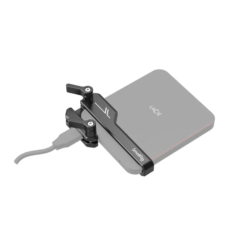 SmallRig Mount for LaCie Portable SSD 2799 enables you to attach the SSD to select cameras rigs such as cages for BMPCC 4K/6K, Sigma FP, and Z CAM. It attaches to the camera cage using two captive 1/4"-20 screws, securing both the SSD and its connected USB Type-C cable by ratcheting thumbscrew. The mount's offset attachment on the top left corner of the cage helps avoid interference with an attached top handle, side handle, or other accessories.