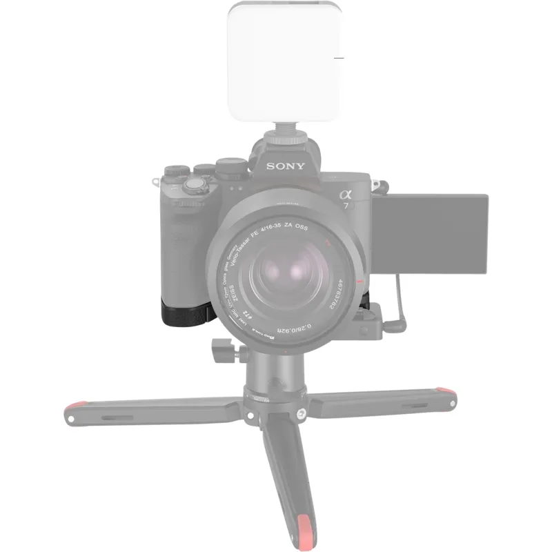 SmallRig Baseplate for Sony Alpha 7R V / Alpha 7 IV 3666 aims to improve grip experience and enable tripod and handheld shooting while protecting the bottom of the camera. It attaches to the bottom of the camera via a 1/4" -20 screw and locating pin, with features of a built-in silicone pad to prevent scratches and twisting. There is a spindle spanner at the battery door which fits the camera curve and leaves room for a little finger for comfortable grip; embedded in select genuine leather in the baseplate integrates into the camera body. 1/4"-20 threaded holes and cold shoes at the bottom support mini tripods and microphones. Besides, the Arca compatible baseplate allows quick switching between the tripod, stabilizer (DJI RS 2 / RSC 2 / RS 3 / RS 3 Pro), and handheld shooting. An accessible built-in magnetic spanner facilitates disassembly and assembly.