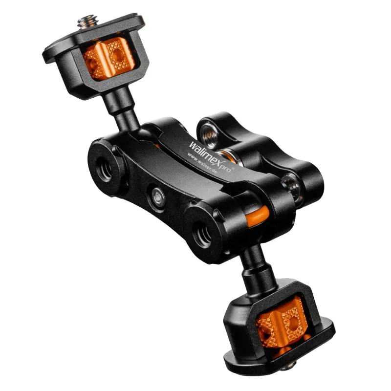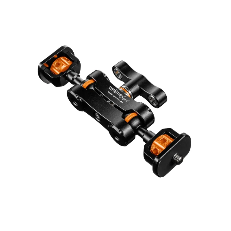 The Walimex pro Mini Magic Arm Premium is a multifunctional, flexible tool that should not be missing from any photo or video equipment. Made of high-quality aluminium, the articulated arm has two buffered ball joints that can be rotated 360°. This allows you to achieve individual locking and positioning. Particularly practical is the central wing screw in the middle of the articulated arm, with which you can fix all two joints simultaneously according to your needs. You are also flexible with regard to your connection options: Two 1/4 inch screws with rubber pads protect your equipment from scratches or damage at the same time. Thanks to another 1/4 inch thread and two 3/8 inch threads, the Mini Magic Arm Premium is flexibly expandable. In the wing screw there are two adapters countersunk from 1/4 inch to 3/8 inch, which can be used to make the articulated arm compatible for 3/8 inch threads.