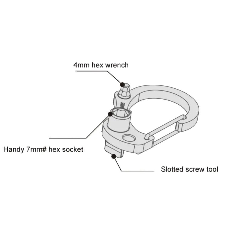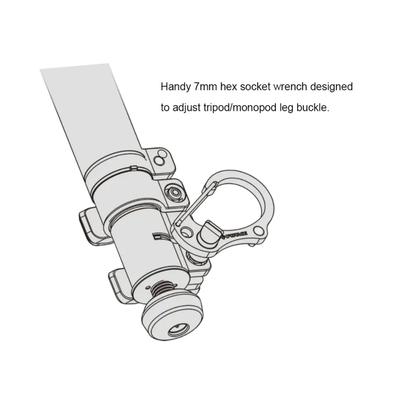 The versatile Tool Hook has an integrated 4mm hex wrench designed to adjust to a tripod or monopod leg buckle. The Hook features a 7mm hex socket and a slotted screw tool to adjust camera plate screws, for example. The Hook is made of Aluminium and weighs only 25g.
