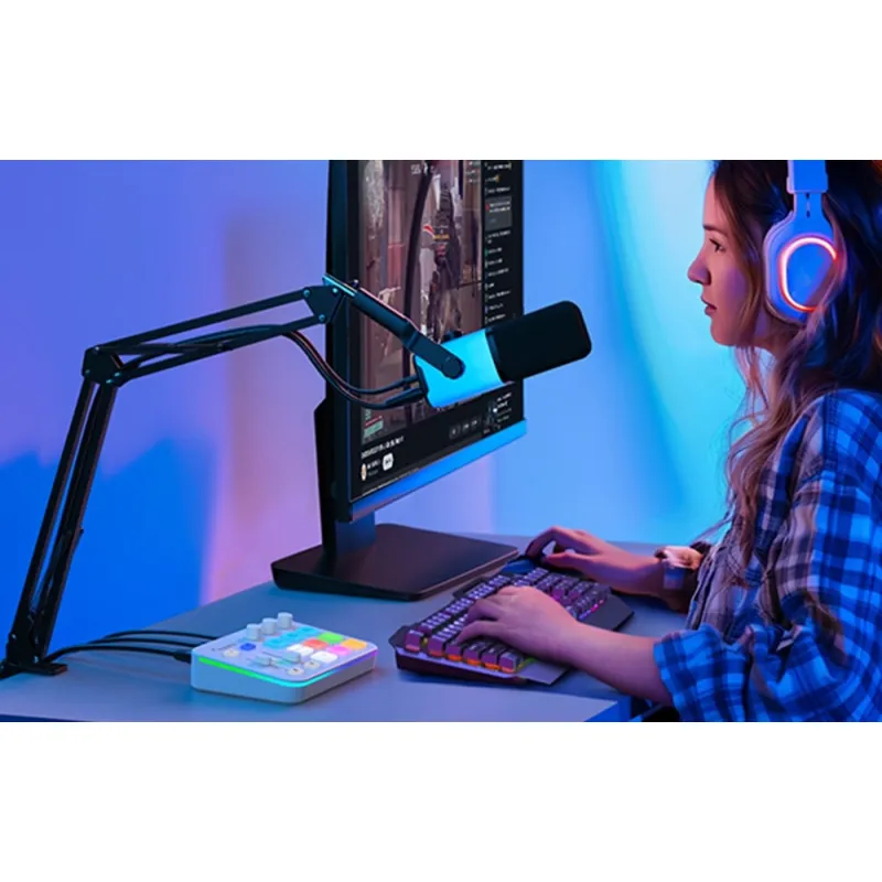 Продукт оснащен потрясающей RGB подсветкой, придающей ему уникальное игровое ощущение. Вы можете настроить его в соответствии с декором вашей стриминговой комнаты, выбрав из 11 оригинальных режимов. Кнопки и световые полосы можно персонализировать с помощью однотонных цветов, градиентов и эффектов радуги.