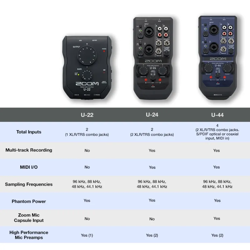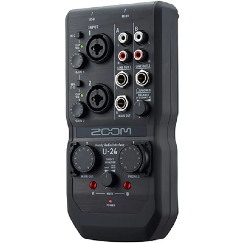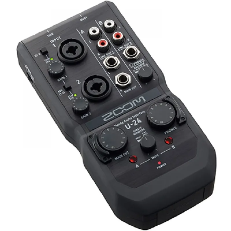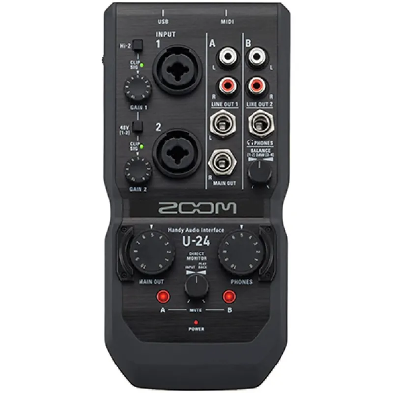 Inspired by our Zoom H-series recorders, the U-24 is equipped with high-performance, low-noise mic preamps (-119.5 dB EIN) that enable recording and playback at resolutions up to 24-bit/96 kHz. You can also use U-24 as a studio-quality headphone amp and listen to your favorite music in full fidelity.