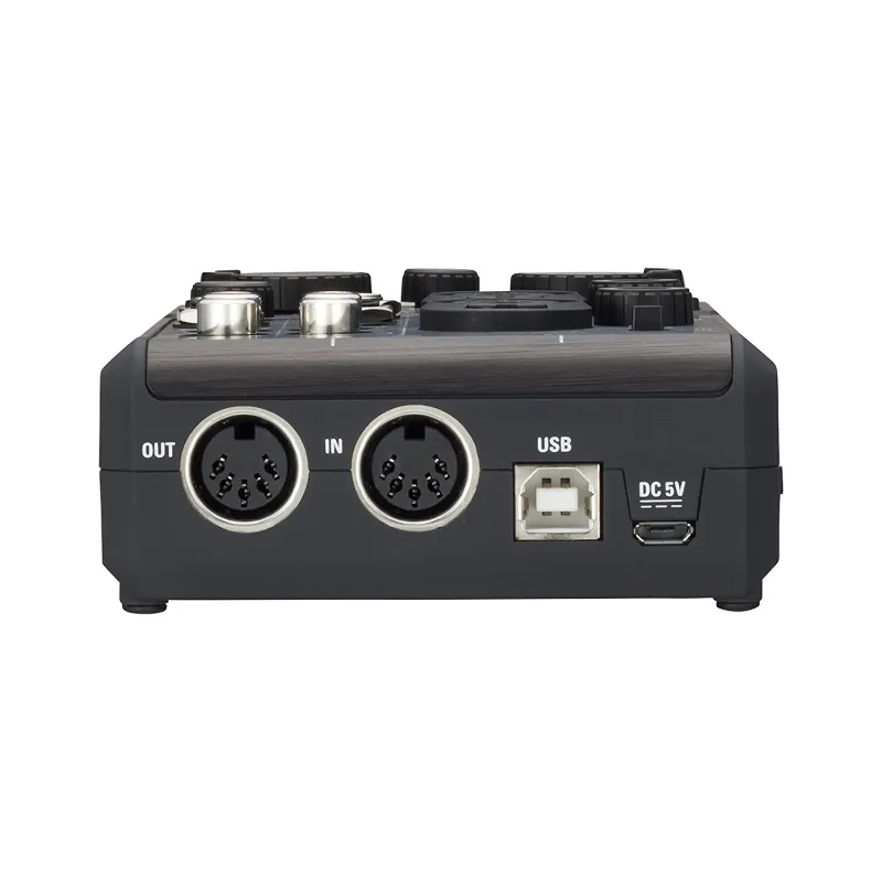 The U-24 is equipped with an essential collection of inputs and outputs for streamlined recording. Two combo inputs with independent gain knobs and multi-color level indicators allow you to connect mics, keyboards, mixers, and more. 48V phantom power can be supplied to both inputs, and input 1 supports Hi-Z for connecting guitars, basses, or other passive instruments. MIDI input and output jacks allow you to use devices like keyboards, controllers, synthesizers, and drum machines.