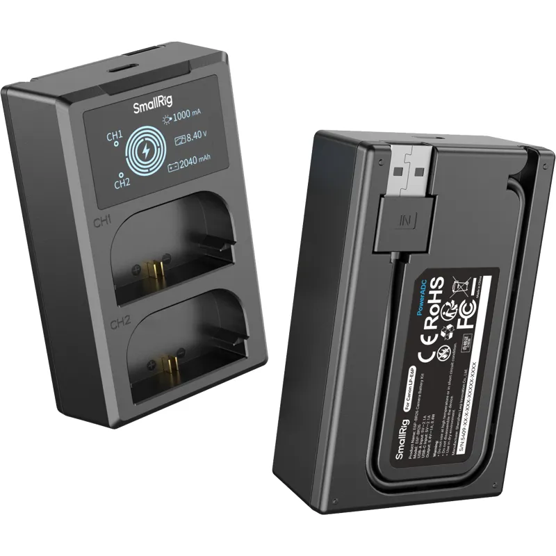 SMALLRIG 5485 Turbo зарядный комплект разработан для аккумуляторов камер LP-E6P, обеспечивая быстрое и эффективное решение для зарядки. Этот комплект включает в себя двухканальное зарядное устройство, которое может заряжать два аккумулятора одновременно, гарантируя, что вы всегда готовы к следующей съемке.