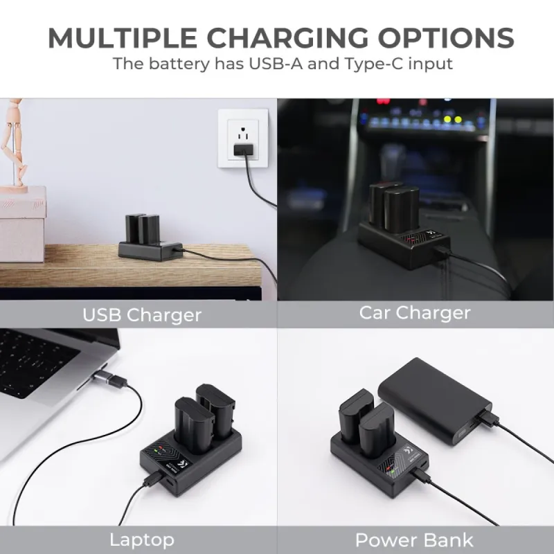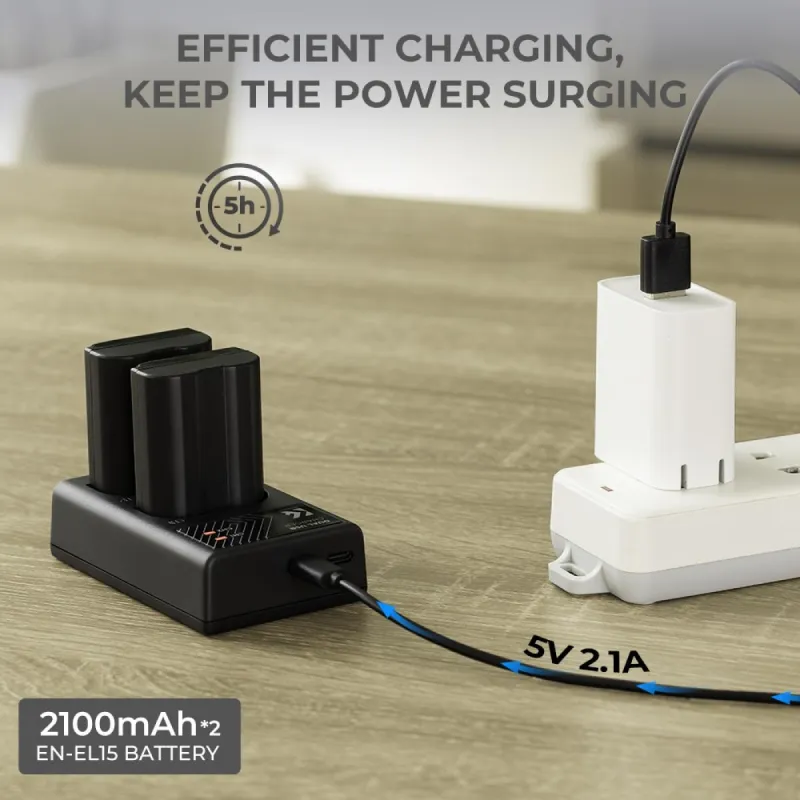 K&F CONCEPT Nikon EN-EL15 Replacement Battery Charger Set. В комплект входят два сменных аккумулятора Nikon EN-EL15 7,4 В 2100 мАч и двухпортовое зарядное устройство Micro USB/Type C, которое удобно брать с собой на природу и не беспокоиться об отключении питания, когда вы хотите запечатлеть прекрасные моменты.