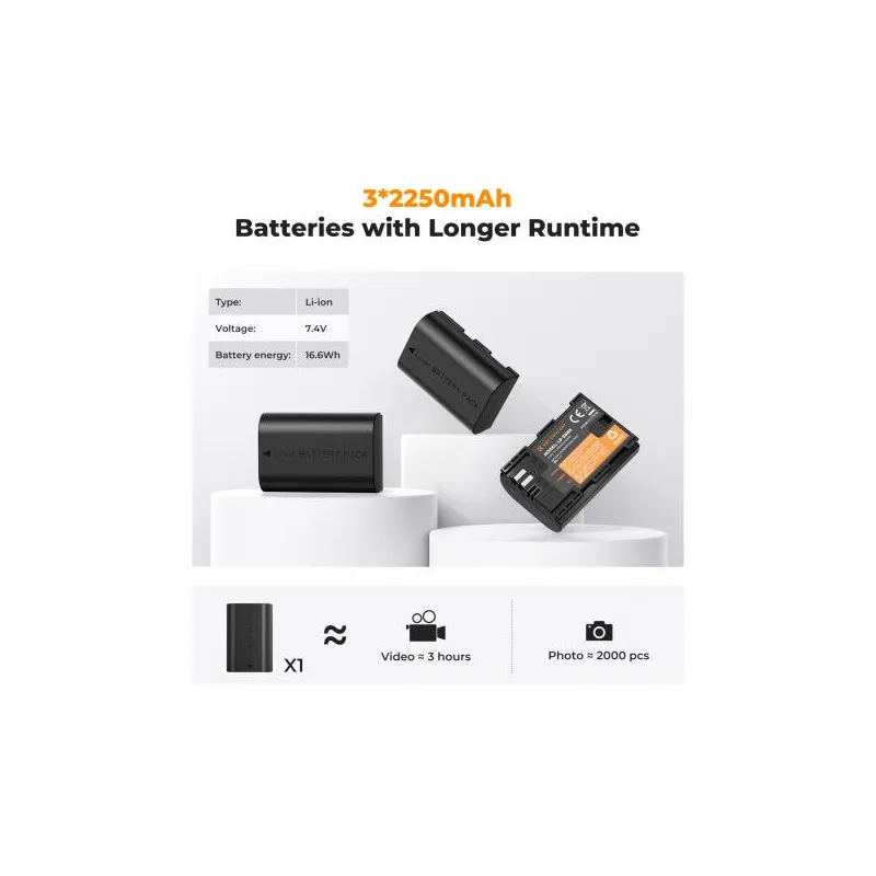 Комплект зарядного устройства и 3 батарей, полностью совместимых с камерами Canon, работающими на батареях LP-E6NH/LP-E6N/LP-E6, такими как Canon EOS R7, R5, EOS R6, EOS R 5D II, III, IV, 6D, 6D II, 7D, 7D II, 60D, 70D, 80D, 90D и другими устройствами, использующими батареи LP-E6NH. Зарядное устройство на 3 слота может одновременно заряжать 3 батареи, а умный LCD-дисплей четко показывает уровень заряда. Долговечность батарей: 3 x 2250mAh LP-E6NH батареи обеспечивают длительное время работы камеры и устраняют беспокойство о разрядке.