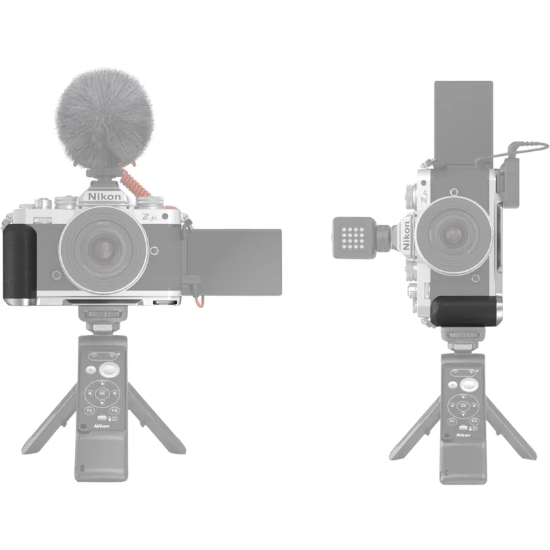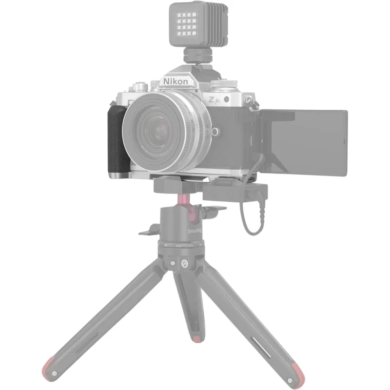 SmallRig L-Shape Grip for Nikon Z fc Camera 3480 is designed to provide a comfortable grip. The retro-style grip shares a similar texture and color with the camera; the baseplate shares the same silver surface treatment with the camera and fits perfectly. The L grip secures to the camera via a 1/4"-20 D-ring screw on the bottom and comes with a built-in 1/4"-20 threaded hole on the grip that enables vertical shooting on a tripod. The baseplate features a built-in Arca Swiss plate to quickly switch to tripod shooting, and a 1/4"-20 threaded hole at the center that supports a tripod or Manfrotto quick release plate. In addition, the baseplate features a built-in cold shoe that allows attaching microphone, light, and other accessories; the plate also comes with a slot for the wrist strap. The grip adopts a compact and lightweight design, which is easy to carry around.