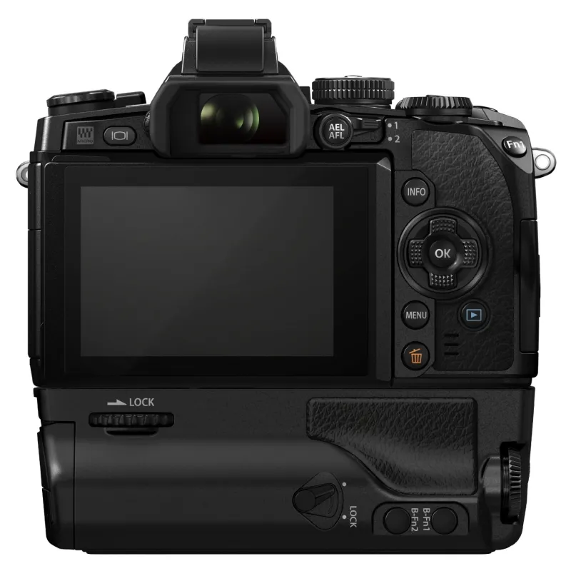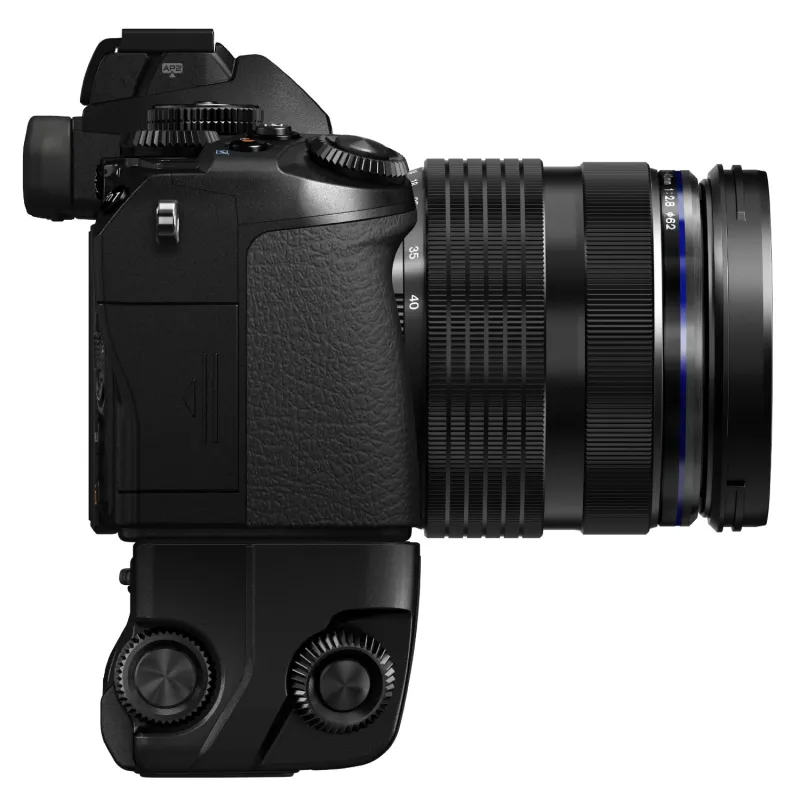 Пыле-, влагозащищенная и морозостойкая батарейная ручка была разработана специально для OM-D E-M1. Использование HLD-7 увеличивает время работы камеры и дает больше удобства при портретной съемке за счет наличия у нее дополнительной кнопки спуска затвора. Также на корпусе присутствуют 2 управляющих диска и 2 настраиваемых кнопки.