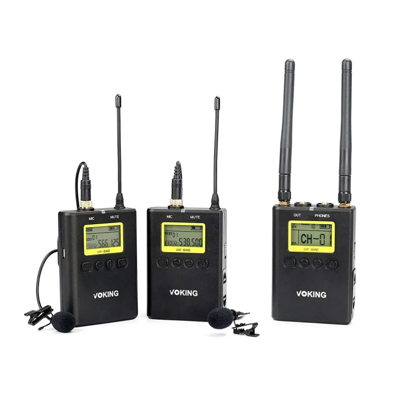 The Voking VK-WM220 kit consists of two transmitters, one receiver, two lavalier microphones and corresponding accessories.
