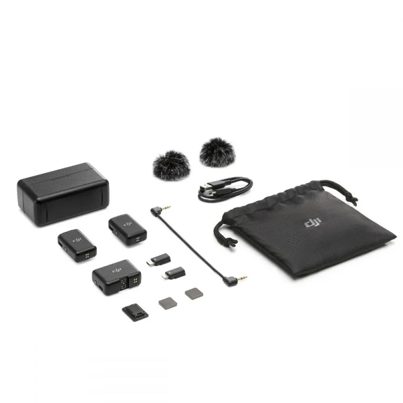 DJI Mic поставляется с двумя передатчиками, каждый из которых оснащен встроенными микрофонами. Оба передатчика поддерживают всенаправленный звук, что делает их идеальными для проведения интервью с несколькими людьми и работы в небольших студиях.