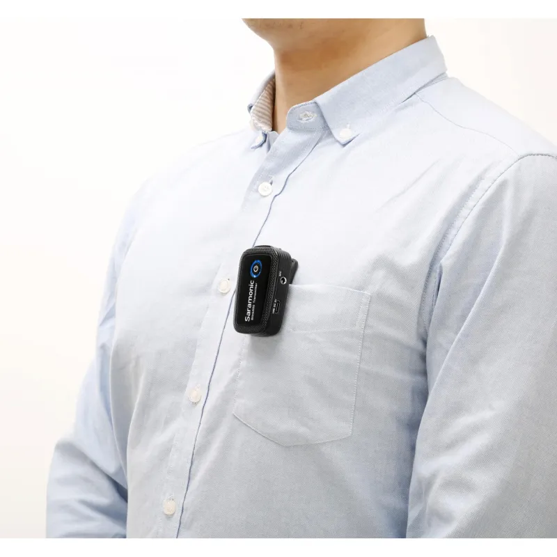 The Saramonic Blink 500 TX is a remarkably compact and lightweight clip-on wireless microphone transmitter that delivers broadcast-quality sound and is designed to work with the Blink 500 RX, RXDi, and RXUC portable dual-receivers (available separately). If you have a Blink 500 system that came with a single transmitter and you want to expand to two transmitters, the Blink 500 TX is exactly what you need. Offers Excellent Performance Effortlessly Some wireless microphone transmitters are complicated to operate and require detailed knowledge of their menus and settings, but the Blink 500 TX is so technically advanced that it couldn't be easier to use. Even though there are very few controls to adjust, it does a lot behind the scenes to ensure excellent performance. The Blink 500 TX operates on the interference-free 2.4GHz spectrum, and automatically hops channels to avoid static noise and audio dropouts. Pairing it to a receiver is simple, and all of the complicated aspects of using wireless microphones happen seamlessly in the background, letting you concentrate on storytelling. Built-In Microphone The Blink 500 TX has an excellent sounding built-in microphone and the entire device is small and light enough to clip directly to shirt collars, clothing, or slide into a pocket. It is also versatile enough to set on a table or podium, or even used handheld. The built-in microphone is capable of capturing voices clearly and naturally, but if you want an even cleaner visual look, it also operates as a traditional bodypack transmitter with the included SR-M1 professional omnidirectional clip-on lavalier microphone, providing an even more professional and visually discreet audio solution. Easy Controlling of Audio Levels One of the tricky aspects of capturing sound for video is controlling the audio levels. Some people speak very loudly, while others speak very softly. That's why the Blink 500 TX has easy-to-use gain buttons to raise or lower the levels, and an intelligent LED display shows you where it's set. Its internal Lithium battery gets 5 hours of life from a charge, and its USB-C charging port can be used to power or recharge the unit in the field with a portable USB battery pack. The 10-milliwatt power of the transmitter gives you an impressive range of 98 feet (30 meters) with obstacles, and 164 feet (50 meters) in open spaces. Compact and Lightweight Construction Thanks to the ultra-compact and lightweight construction, this dual-receiver easily tucks away in a small pocket, so you can effortlessly bring it with you everywhere you go. Delivering professional quality sound, the Blink 500 TX is ideal for filmmakers, journalists, vloggers, YouTube creators, corporate video producers, or any content creator that needs an incredibly easy-to-use wireless system that won't slow them down. What's in the Box Saramonic Blink 500 TX Wireless Microphone Transmitter with Built-In Microphone and Clip SR-M1 Omnidirectional Lavalier Microphone Alligator-Style Lavalier Microphone Clip Foam Lavalier Windscreen 1-Feet (30.5 cm) Gold-Plated USB-C to USB-A Charging Cables Specifications Saramonic Blink 500 TX Wireless Microphone Transmitter Frequency: 2.4GHz Oscillator type: Gaussian Frequency-Shift Keying (GFSK) RF frequency band: 2400 to 2483.5 MHz RF output power: 10 mW Signal to noise ratio: ≥70dB Voice delay: ≤6ms Reference audio input level: -30 to -42dBv (Microphone Input, 0 dB Attenuation) Audio gain control: 11dB, 18dB, 25dB Plug-in power: Yes, 1V Distortion: ≤0.1% Digital resolution: 24-bit / 48kHz Frequency response: 20Hz to 16kHz Maximum operating range: 98.4-feet (30m) with Obstacles, 164-feet (50m) in Open Area Maximum number of simultaneous systems: 18 (up to 36 Microphones) Antenna: Built-in 1/4λ Wire Antenna Buttons: On / Off / Pair, Volume Up, Volume Down Battery: Built-in Li-ion 3.7V / 400mAh Approximate battery life: 5 hours Charging connector: USB Type-C (1.5 hours to be fully charged) Input: 1/8-inch (3.5mm) Microphone Input Indicators: 4 x Blue LEDs: Indicates Power and Audio Level, 1 x Red LED: Indicates Low Battery Level, 1 x Green LED: Flashing when Charging / Off when Charge Finished Microphone: Built-in pressure operated electret condenser Microphone pickup pattern: Omnidirectional (Built-in microphone and external lavalier) Microphone frequency range: 50Hz-18KHz (Built-in microphone and external lavalier) Microphone equivalent noise level: >58dB (Built-in microphone and external lavalier) Maximum SPL: 120dB (Built-in microphone), 110dB (External lavalier) Mounting clip: Built-in Operating temperature: 0 degree to 50 degree Celsius Storage temperature: -20 degree to +50 degree Celsius Dimensions: 2.5 x 1.7 x .65 inches (63 x 43 x 16.5mm) Weight: 1.2 oz (34g)