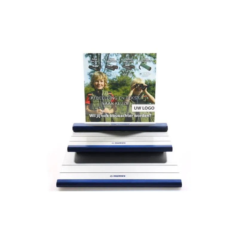 This set consists of 20 binoculars and a binocular display with personalized features. Four different binoculars are supplied, which you can mount on the binoculars display. On the display is a photo of your choice, with your own logo and your chosen sales prices. An extra low purchase price makes it possible to make a nice margin on the binoculars. After ordering we will contact you to discuss your wishes.