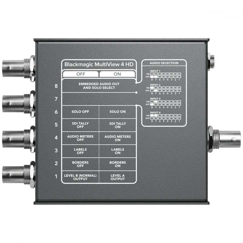 Designed to be plug and play, connected sources will instantly be displayed in a standard 2x2 grid layout. Customers can use the mini switches to turn on audio meters, choose which audio to output, as well as create custom labels, and more.