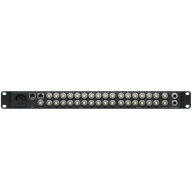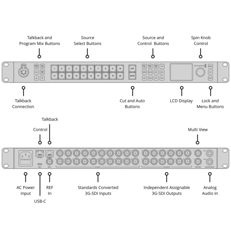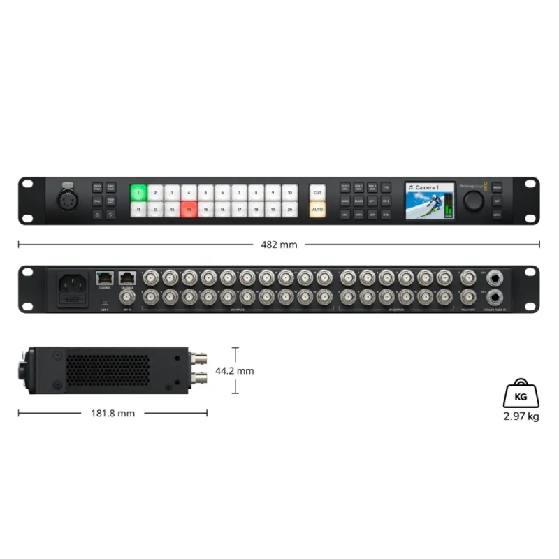 ATEM 2 M/E Constellation HD is a high definition live production switcher packed with advanced features! The 2 M/E design includes 20 standards converted 3G‑SDI inputs and 12 independent 3G‑SDI aux outputs! It also includes a USB webcam output, SuperSource processor, DVEs, chroma keyers, media players, multiviews and more! You even get built in talkback and a professional built in Fairlight audio mixer with EQ and dynamics!