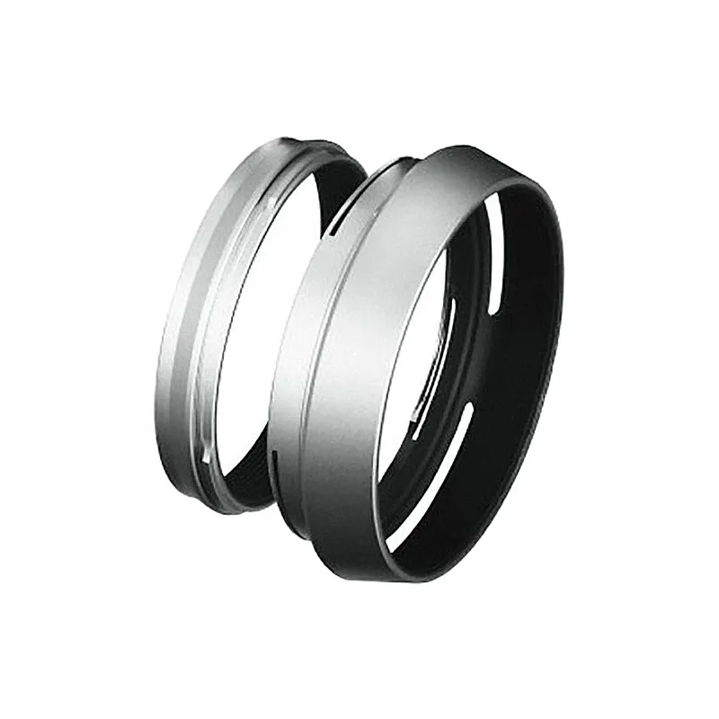 Included with the lens hood is the silver AR-X100 Adapter Ring, which facilitates the attachment of the lens hood to the lens.