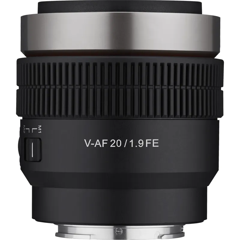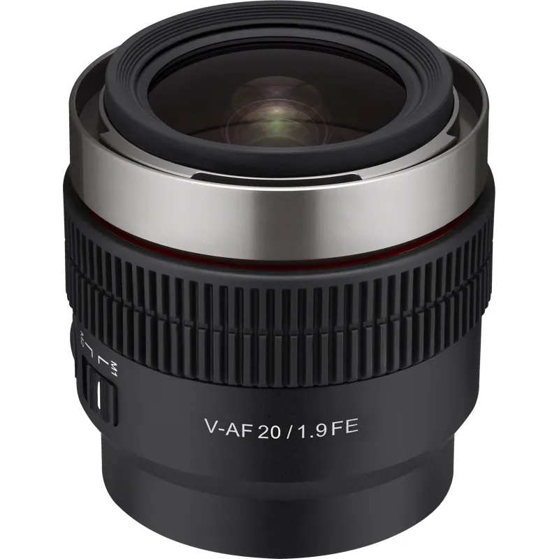 The tally lamp indicates recording status, a feature popular among YouTubers. A customizable dial on the side allows for manual focus or aperture adjustment, with a focus hold button for locking focus. The V-AF 20mm T1.9 boasts advanced construction for a cinematic look.