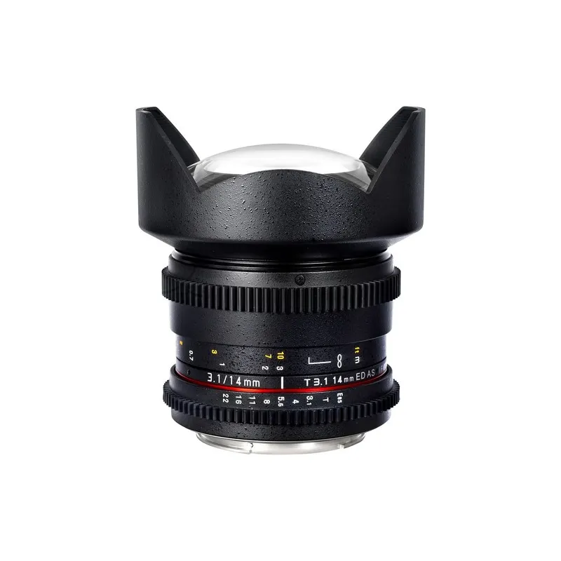 The Samyang 14mm T3.1 VDSLR ED AS IF UMC II is one of the lenses making up the Samyang VDSLR Kit. These lenses produce the same image color and have a uniform aperture and focus ring position to ensure maximum shooting comfort.