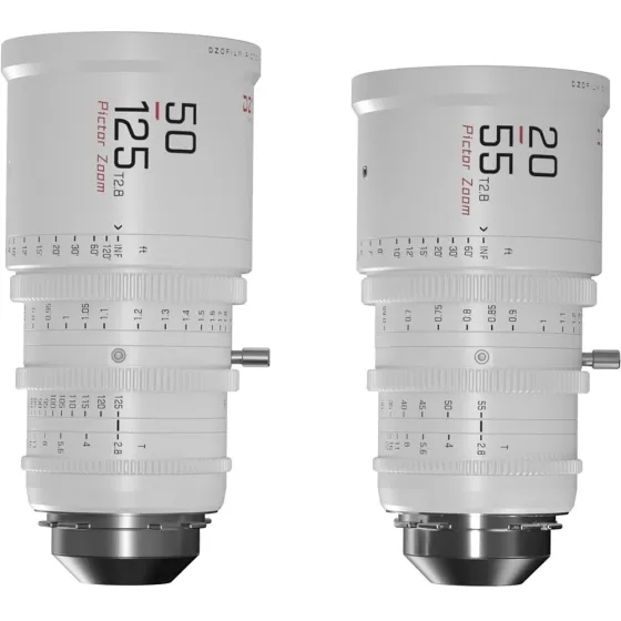 A set of DZOFilm Pictor 50-125mm T2.8 S35 and DZOFilm Pictor 20-55mm T2.8 S35 lenses in white color.
