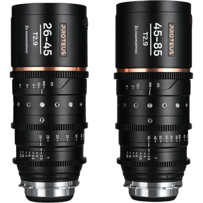 Серия Laowa Proteus 2x Anamorphic Zoom - это самый легкий и компактный 2x передний анаморфный зум-объектив для S35 сенсоров. Он предлагает универсальный диапазон зума более 3x с двумя объективами (26-45 мм и 45-85 мм) и весит всего 1,5 кг, что делает его удобным для работы в ограниченных пространствах.