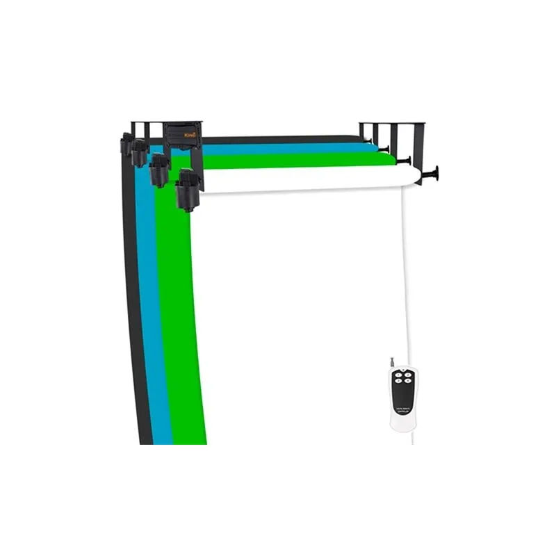 Сматывайте и разматывайте фоновые рулоны одним нажатием кнопки. B-4WE - это электрическая система от StudioKing, которая может перевозить до 4 рулонов. С помощью этой системы вы легко выбираете, какой цвет вы хотите использовать в качестве фона. Вы сами определяете ширину фоновой системы в зависимости от рулона бумаги. Эта фоновая система работает с рулонами бумаги шириной 1,35 и 2,18. С помощью прилагаемого пульта дистанционного управления вы можете сворачивать рулоны вверх или вниз.