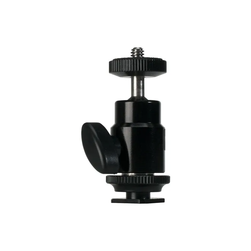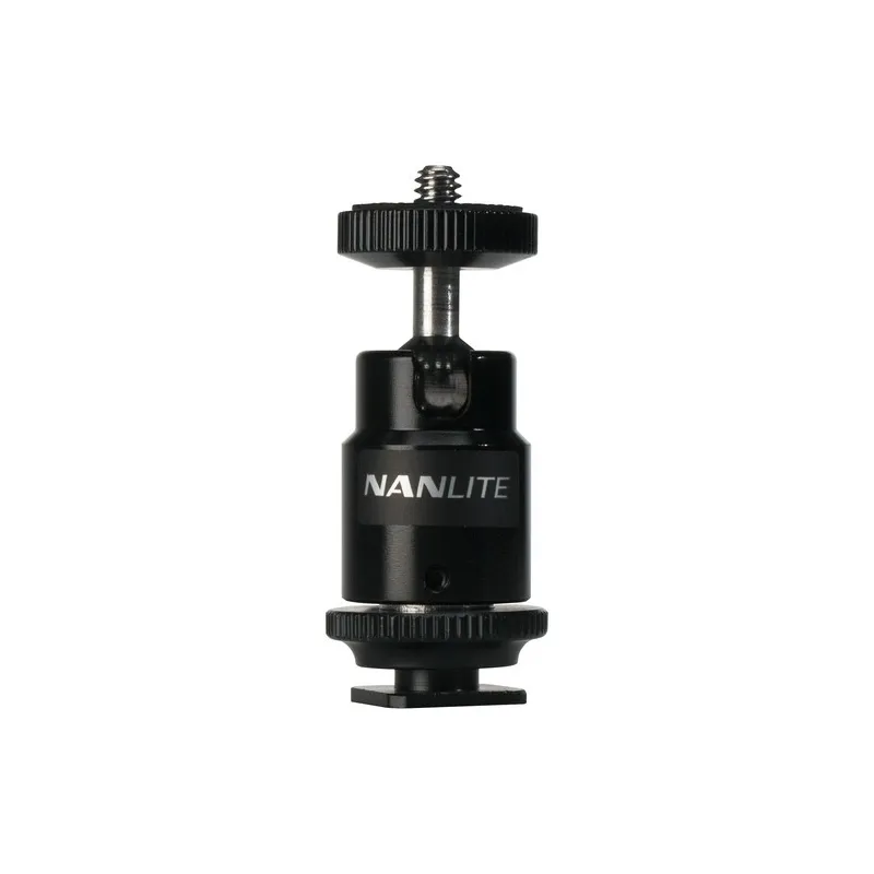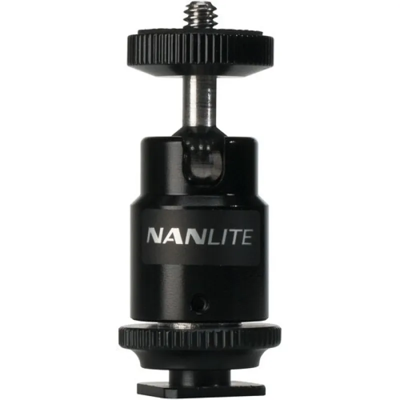 The Nanlite Mini Ball Head with Hot Shoe Adapter securely slides into your camera's hot shoe and also offers a female 1/4"-20 receiver for stand mounting. At the top is a single action locking ball head with a 1/4"-20 male thread that is compatible with a variety of accessories.
