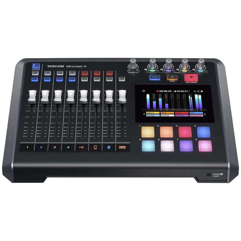 С интерфейсом с 4-падовым сенсорным экраном дл бесшовного управлени, Tascam Mixcast 4 включает четыре входа дл микрофонов с индивидуальным управлением уровнем.