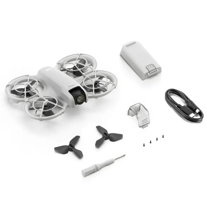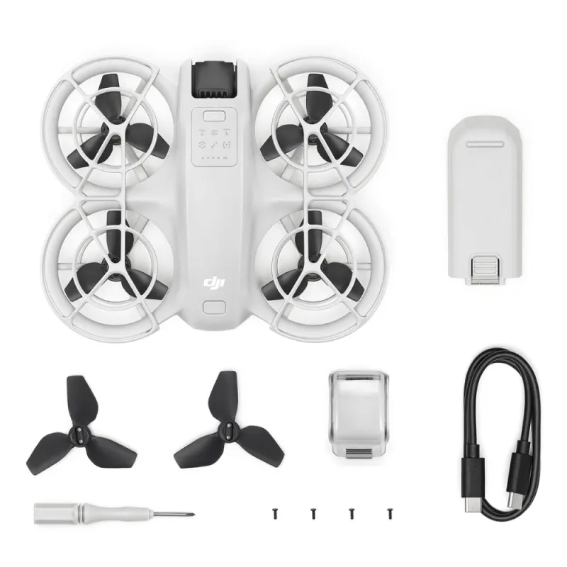 DJI Neo можно управлять с помощью приложения DJI Fly, пультов дистанционного управления или даже голосовых команд. Он поддерживает Wi-Fi соединение со смартфонами, что позволяет управлять им на расстоянии до 50 метров.
