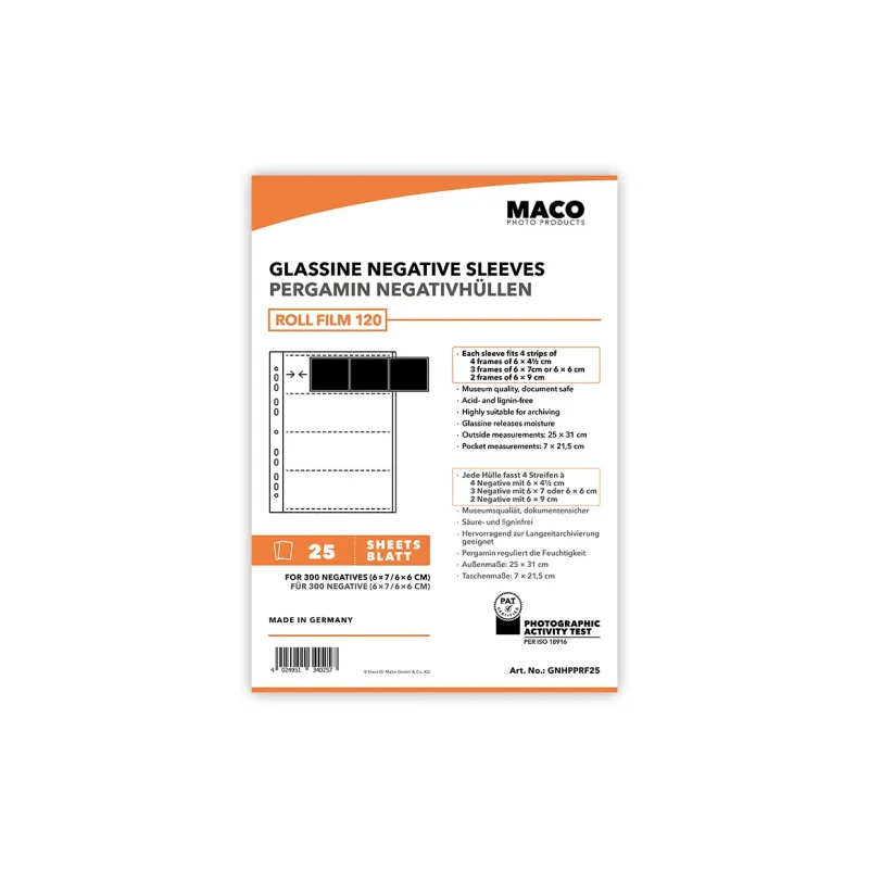 These negative sleeved are made of finely-ground pulp paper which is largely greaseproof, but has a low wet strength. The high level of transparency is achieved by a special mechanical treatment called calendaring. MACO glassine sleeves are made of acid- and lignin-free photo glassine.