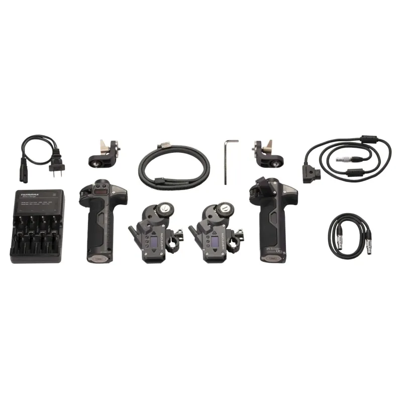 Беспроводная система управления объективом Tilta Nucleus-M Partial Kit V позволяет оператору держать камеру в руках и управлять фокусом и диафрагмой без проводов. В комплект входят контроллеры для левой и правой рукоятки, адаптеры ARRI для розетки, два мотора Nucleus-M, два съемных ремня для объективов (адаптеры для следящей фокусировки объективов DSLR), два кабеля питания моторов и зарядное устройство. Если вы используете объектив, не оснащенный стандартными шестеренками кинематографического типа, используйте прилагаемые ремни для объектива, чтобы добавить шестеренки к объективу.