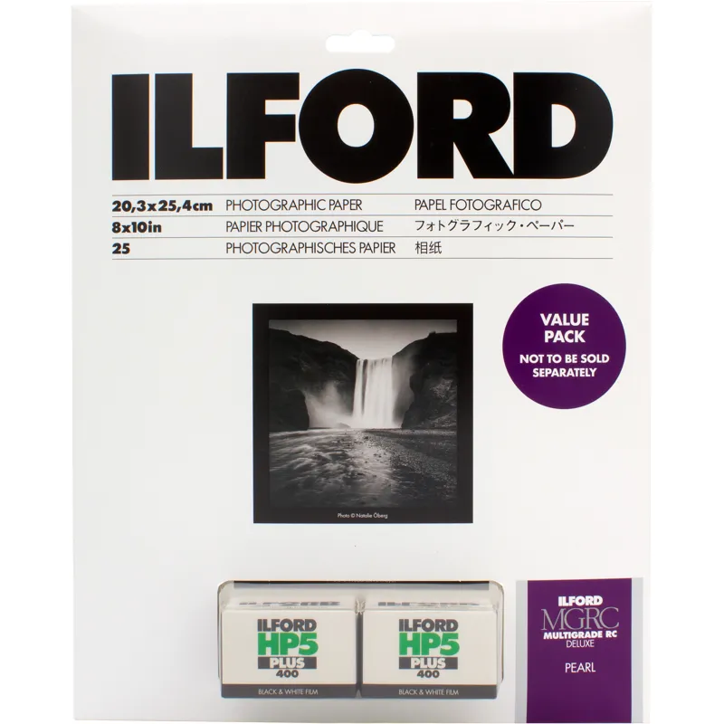 Этот комплект включает в себ упаковку из 25 листов бумаги RC deluxe pearl и 2 рулона пленки HP5 Plus 135/36 эксп.