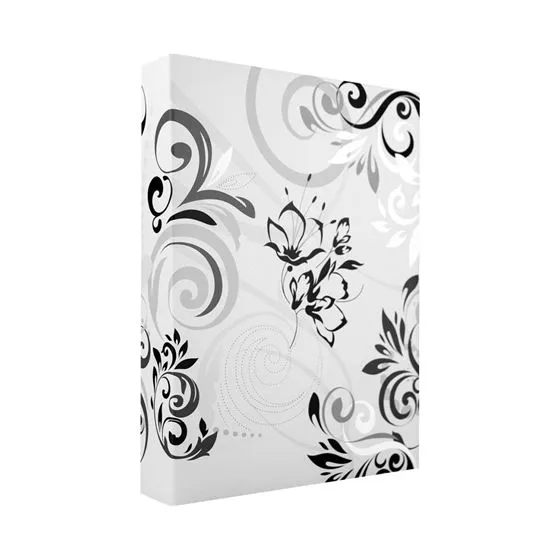 The Zep Slip-In Album EB46100W Umbria White for 100 Photos 10x15 cm by Zep Italia is an empty photo album in which you can store all your photos in one place. This album has slightly sticky sheets in which you can insert 100 photos of 10x15 cm. The dimensions of the cover are 13x16.5 cm. The EB46100W stands out by its white paper cover with grey and black floral prints.