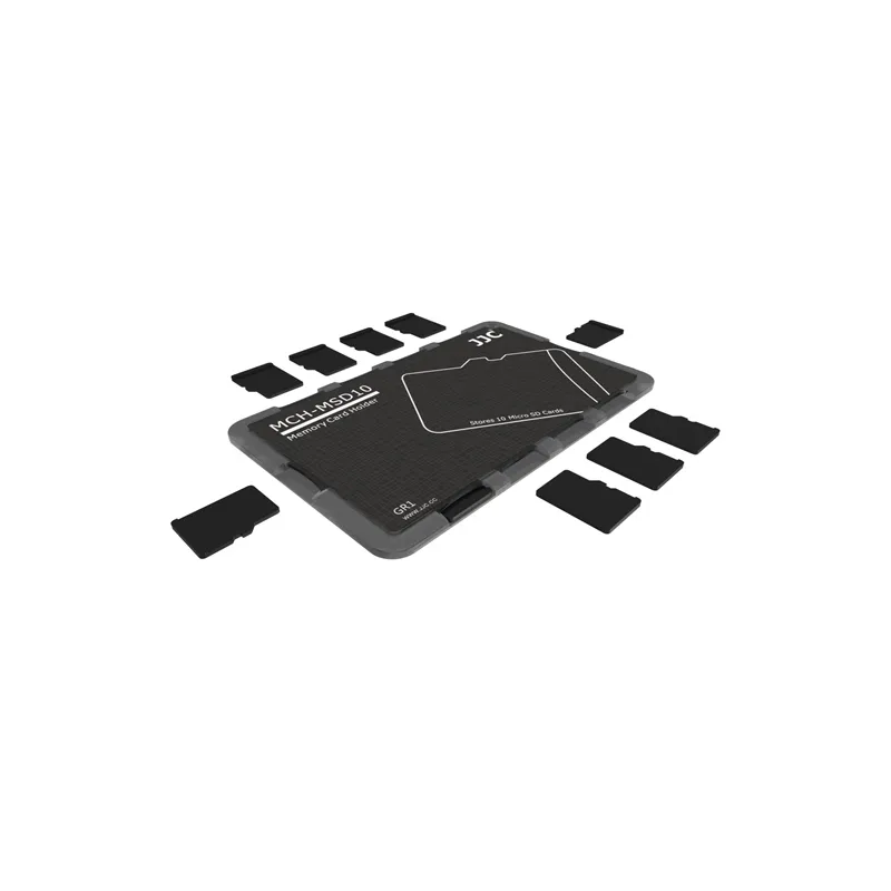 The JJC MCH-MSD10GR Memory Card Holder Black is extremely handy when you use multiple memory cards and need an easy and compact storage place for them. The card holder has the size of a bank card and offers space for up to ten micro SD cards thanks to pre-shaped cutouts. These keep your cards securely in place, yet they can be easily taken out again. Due to its compact size, you can simply store the JJC Memory Card Holder in the same place as your bank cards and/or your driving licence. You can even keep it on your key ring through the hole in the housing.