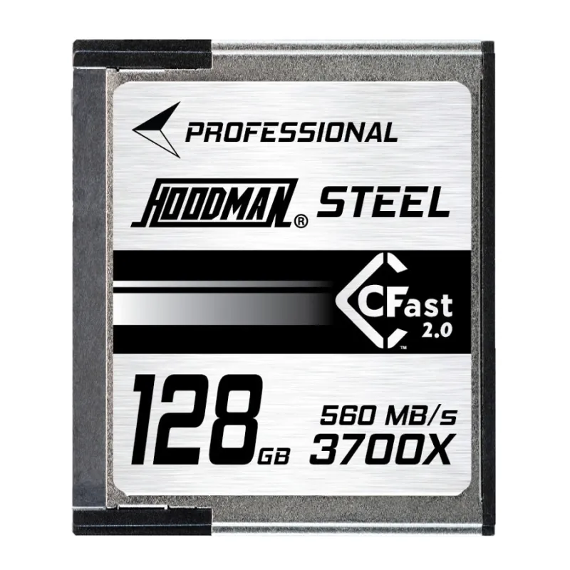 The HCFAST Steel Memory Card from Hoodman features a 128GB capacity and a speed rating of 3700x. It supports read speed of 560 MB/s and write speed of 455 MB/s.