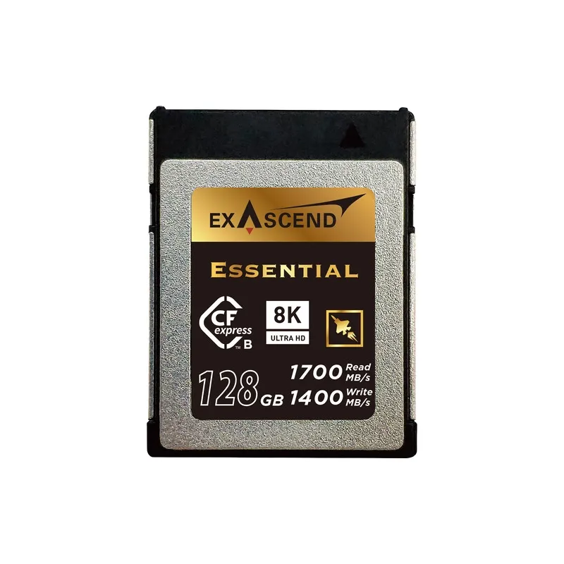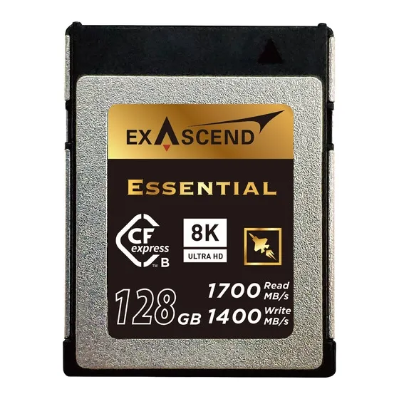 Optimized for professional photography and cinematography, the 128GB Essential Series CFexpress Type B Memory Card from Exascend is an enterprise-grade card with patented technologies to help ensure stability and eliminate dropped frames. This card features a storage capacity of 128GB, 3D TLC flash memory and utilizes the PCIe 3.0 / NVMe 1.4 interface to achieve maximum sequential and sustained read speeds of 1700 MB/s, maximum sequential write speeds of 1400 MB/s, and maximum sustained write speeds of 1400 MB/s. This card also delivers an MTBF of 2 million hours, a Total Bytes Written (TBW) rating of 150TB, an Unrecoverable Bit Error Rate (UBER) of 1 sector per 1017 bits read and is resistant to shock and vibration, as well as temperatures ranging from -10 to 70°C. Furthermore, there is integrated data protection, such as AES 256-bit encryption, data retention, firmware encryption, RAID ECC, TCG Opal, multi-image firmware backup, and more.