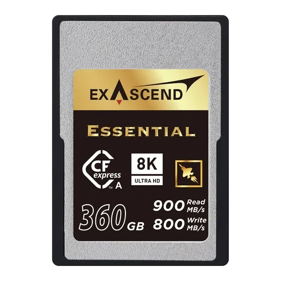 Optimized for professional photography and cinematography, the 360GB Essential Series CFexpress Type A Memory Card from Exascend is certified for 8K raw video and features patented technologies to help ensure high stability without dropping frames. Utilizing 3D TLC flash memory, this 360GB CFexpress Type A card works with compatible camera systems to deliver sequential read speeds of up to 900 MB/s and sequential write speeds of up to 800 MB/s through the PCIe 3.0 / NVMe 1.4 interface. It is also resistant to shock, vibration, and magnets.
