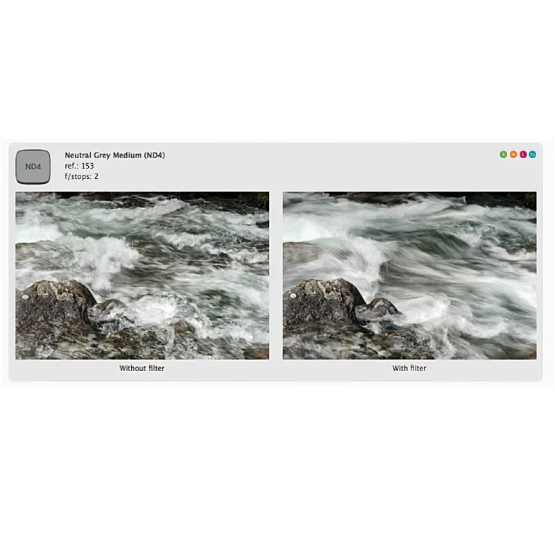 Neutral Density stands for Neutral density. Using this Z153 Neutral Grey filter, you can achieve a longer exposure time than would be allowed by the film speed or sensitivity of your camera's sensor. Think for example of capturing flowing water. This filter reduces light by two stops.
