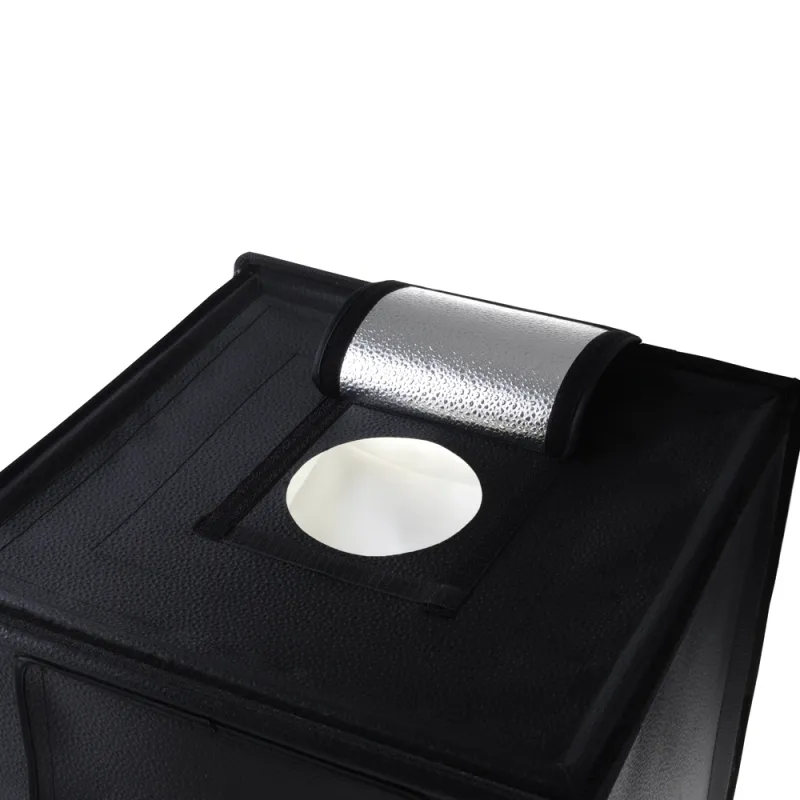 The mini-studio, once unfolded, has a size of 40 x 40 x 40 centimeters. Ideal for taking product photos wherever you want! The background can also be quickly attached using Velcro. With the white, black, gray or orange background you immediately create the desired atmosphere. Moreover, these colors are easy to use as a background for subjects that need to be detached. You can dim the LEDs by means of the rotary knob on the power adapter.