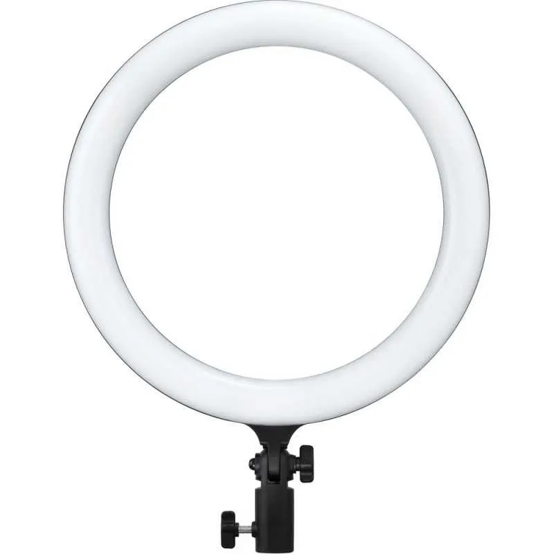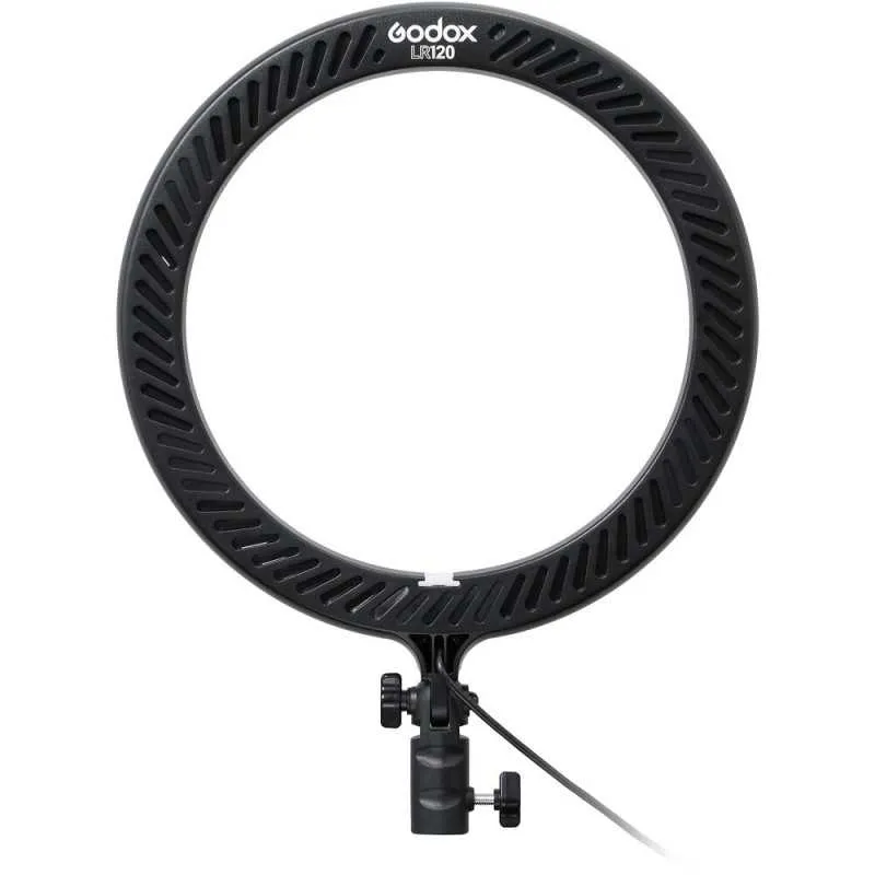 The Black LR120 Bi-Color LED Ring-Light from Godox features a distinctive-shaped light fixture with a color temperature that's variable from 3000 to 6000K to match other fixtures, ambient light conditions, or just for creative expression. The light is mountable to an optional grip head or stand, allowing you to shoot through it for a silky smooth near-shadowless effect that is flattering to your talent's complexion. Ideal for selfies, a smartphone holder is included. A bonus is the unique circular shape of the light reflected in your subject's eyes.