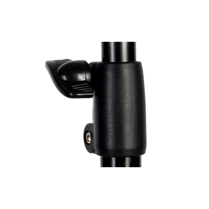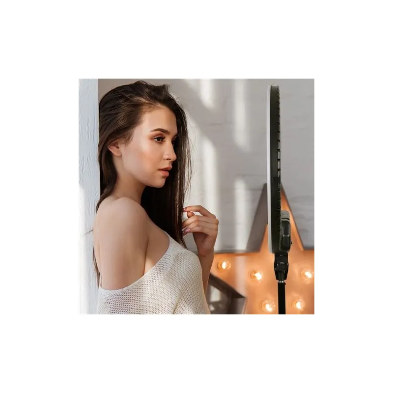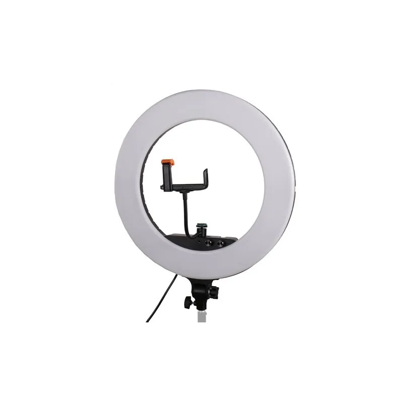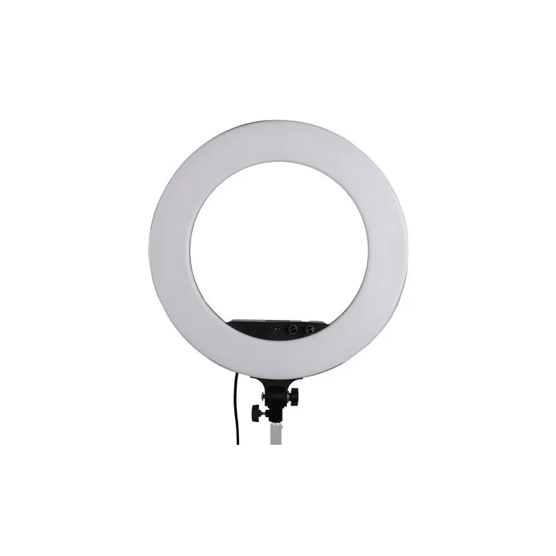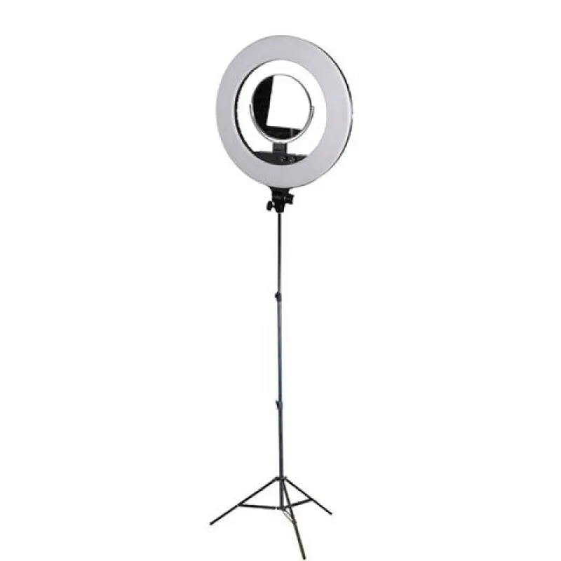 The StudioKing LED-480ASK with Tripod is a LED ring lamp with a tripod, specially designed for visagists, models and vloggers. The included magnifying mirror and smartphone holder can be placed in the ring lamp for a precise make-up procedure. After that you can make the perfect selfie or beauty vlog. The ring lamp provides a strong natural light. Of course, it is also possible to place a DSLR camera, using the 1/4" male adapter found at the optional accessories section. To attach accessories, both the front and top of the LED 480ASK are provided with a 1/4" female thread. On top of the LED-480ASK there’s a cold shoe connection. At the bottom of the LED-480ASK there is a tilting bracket for placing the LED lamp on the included light stand.