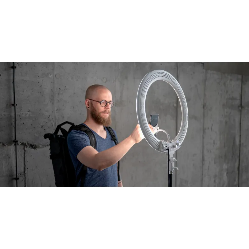 Кольцевой светодиодный прожектор Newell RL-18A - WB (3200 K - 5500 K) - Arctic White имеет встроенный рассеиватель, обеспечивающий естественный и мягкий свет без необходимости использования дополнительных аксессуаров. Мощность и цветовую температуру можно регулировать с помощью эргономичных металлических ручек. Благодаря кольцевой форме лампа обеспечивает равномерное распределение света как на лицах моделей, так и на объектах съемки.
