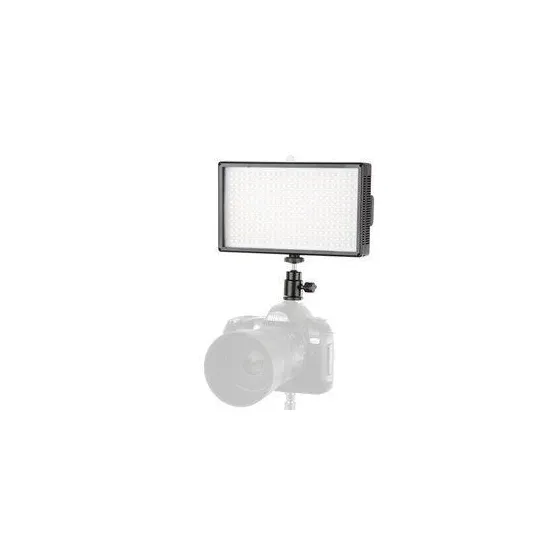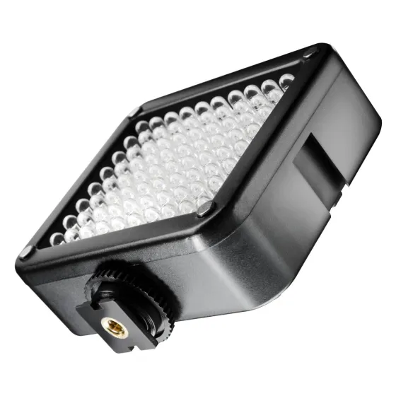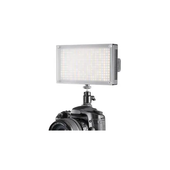 A diffuser panel is included in delivery which ensures a softer light characteristic and therefore is ideal for the portrait and reportage fields. The diffuser panel is simply attached with magnets, which allows a quick attachment and detachment. As no elements are being worn down this way, the lifetime of the LED light and diffuser panel is considerably increased. The LED is mounted via a stationary accessory shoe with 1/4 inch thread. Additionally, a ball head with accessory shoe is available to you, which allows you to tilt the LED light and therefore determine the light direction even more precisely.