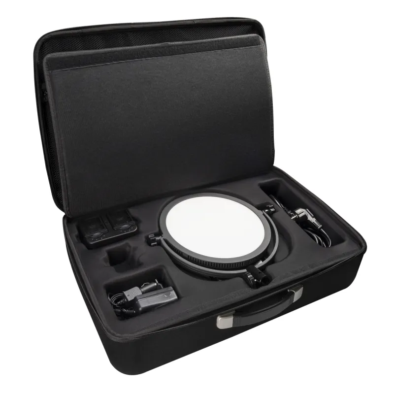 This high quality LED Round 300 is equipped with a backlit LCD display that shows you the light intensity and the battery status in percent. The display is large and well laid out so that it is easily readable from a distance. The LED Round 300 is continuously adjustable from 10% to 100 % dimmable . The power is set accurately and easily repeatable thanks to the specified percentage. So fast and accurate adjustment of the power to your requirements is possible. The LED Round 300 can be operated with a Sony NP -F battery or via power cable, both of which are included.