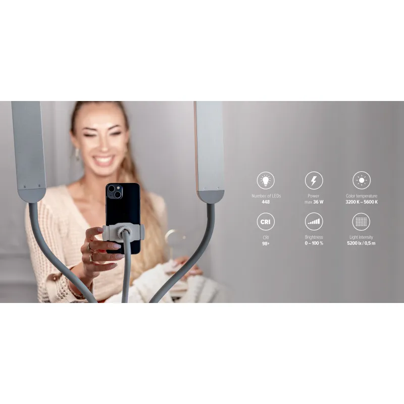 Newell Isztar LED lamp — это полный комплект для создания профессионального видеоконтента, идеально подходящий для влогеров, создателей TikTok и прямых трансляций. Он также станет отличным помощником в индустрии красоты для визажистов и стилистов по наращиванию ресниц. Два светодиодных панела на гибких руках обеспечивают равномерное и настраиваемое освещение. Центральный держатель для смартфона гарантирует стабильность записи. Интуитивная сенсорная панель и пульт дистанционного управления позволяют удобно контролировать яркость и цветовую температуру.