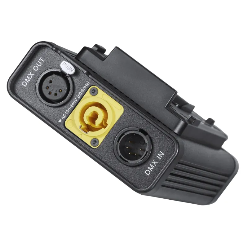 Power & Control The S60Bi come with a separate controlling box which supports AC power supply and V mount battery (optional), the design separating control box from light body secures better cooling effects. Apart from the on board operation on the controlling box, they support APP, RC A6 remote, and DMX as remote control methods.