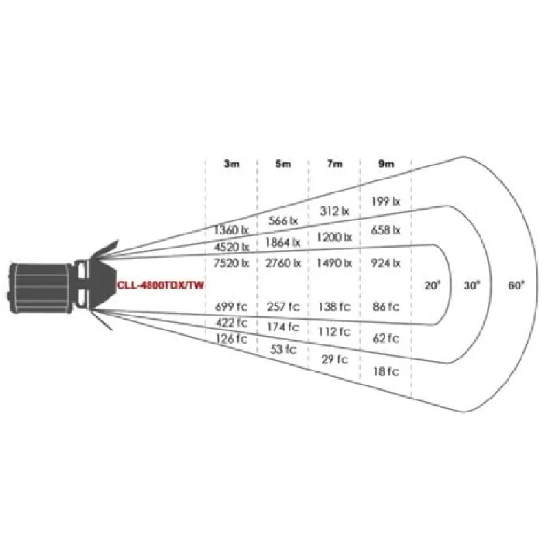 Лампа CLL-4800TDX оснащена линзой Френеля, которая создает плавный переход по краям светового потока. Угол луча можно регулировать от 20 до 60 градусов.
